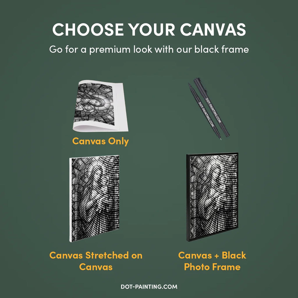 • 1x Toile premium (roulée) : Toile de haute qualité avec le design de votre choix. Nous l’expédions roulée dans un tube rigide, jamais pliée, pour que vous commenciez sur une surface lisse, sans plis.