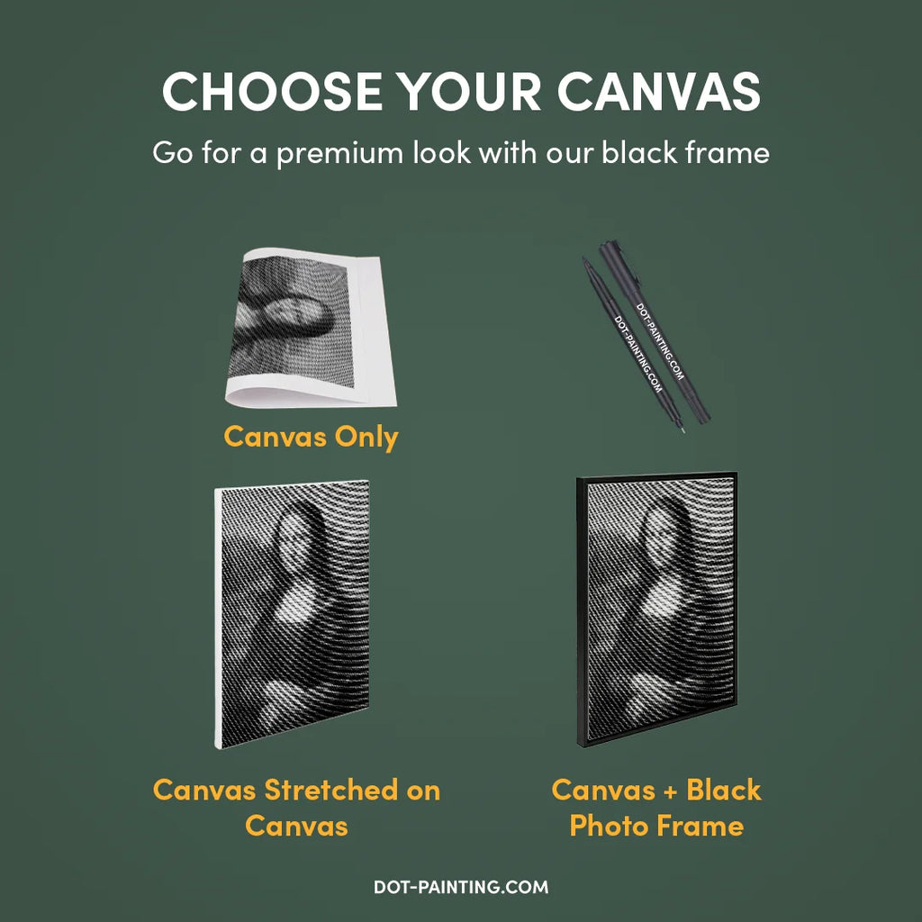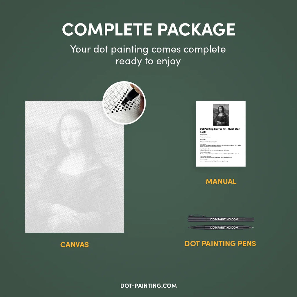 • 1x Toile premium (roulée) : Toile de haute qualité avec le design de votre choix. Nous l’expédions roulée dans un tube rigide, jamais pliée, pour que vous commenciez sur une surface lisse, sans plis.