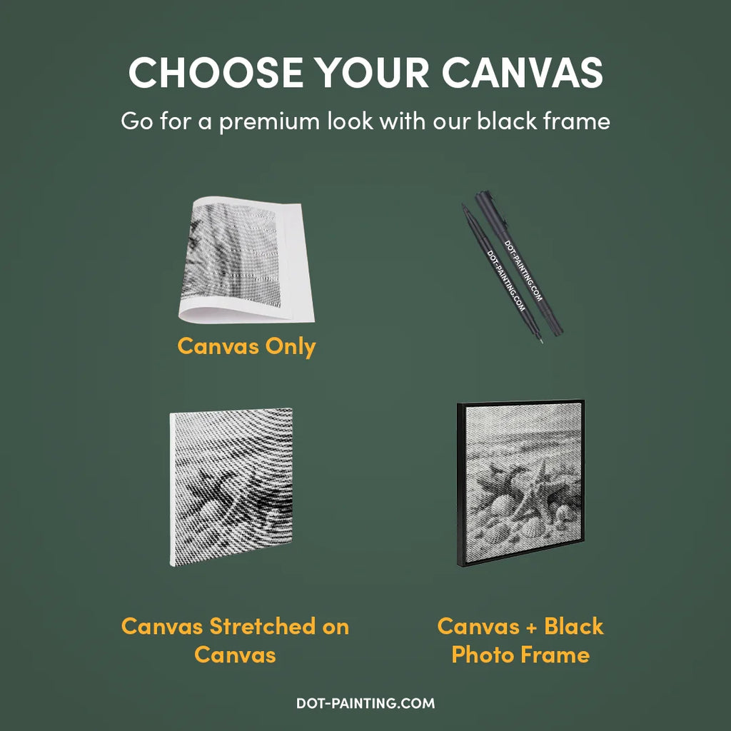 • 1x Toile premium (roulée) : Toile de haute qualité avec le design de votre choix. Nous l’expédions roulée dans un tube rigide, jamais pliée, pour que vous commenciez sur une surface lisse, sans plis.