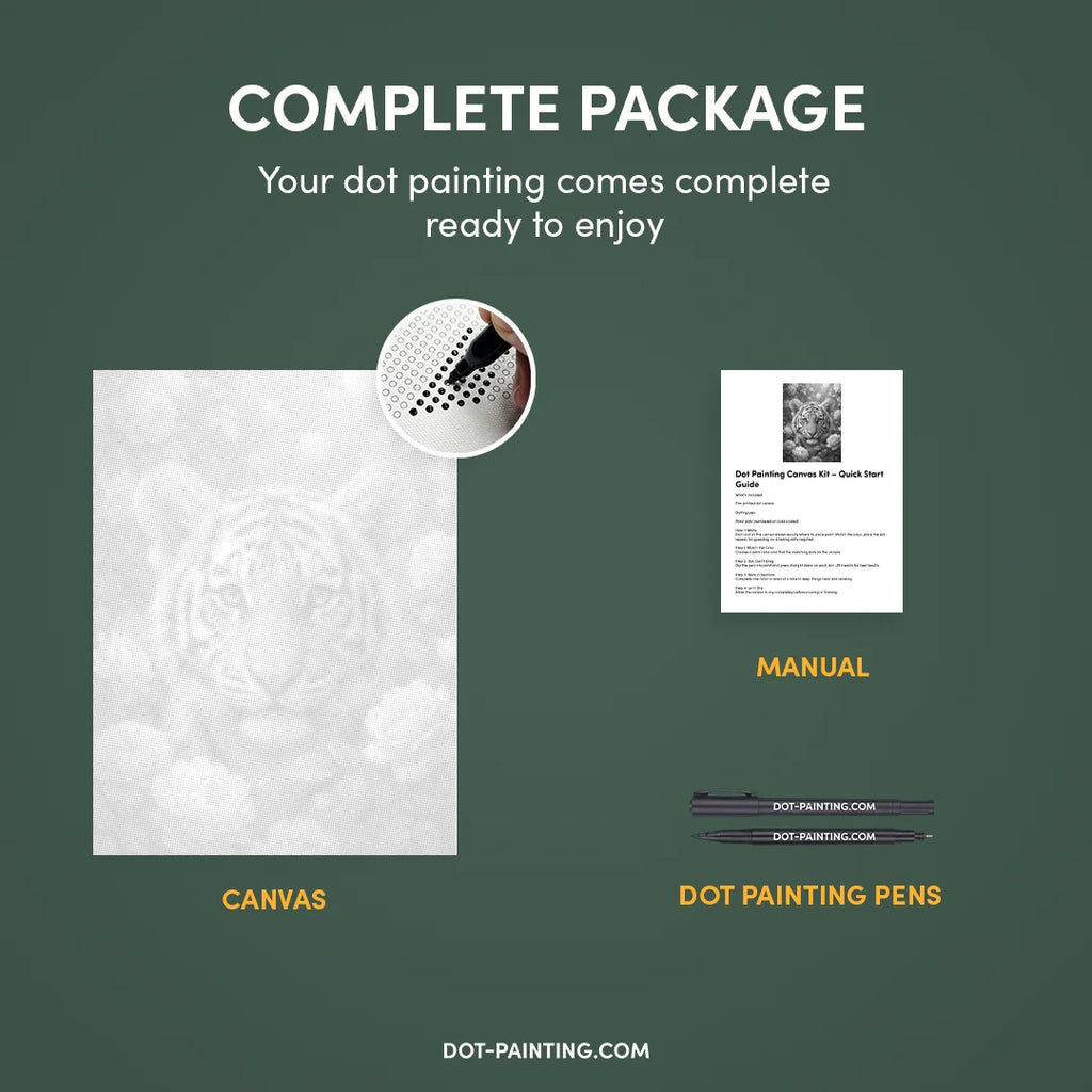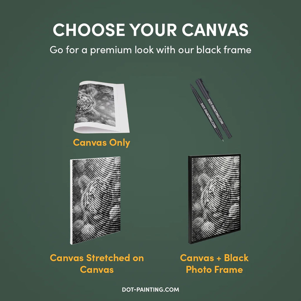 • 1x Toile premium (roulée) : Toile de haute qualité avec le design de votre choix. Nous l’expédions roulée dans un tube rigide, jamais pliée, pour que vous commenciez sur une surface lisse, sans plis.