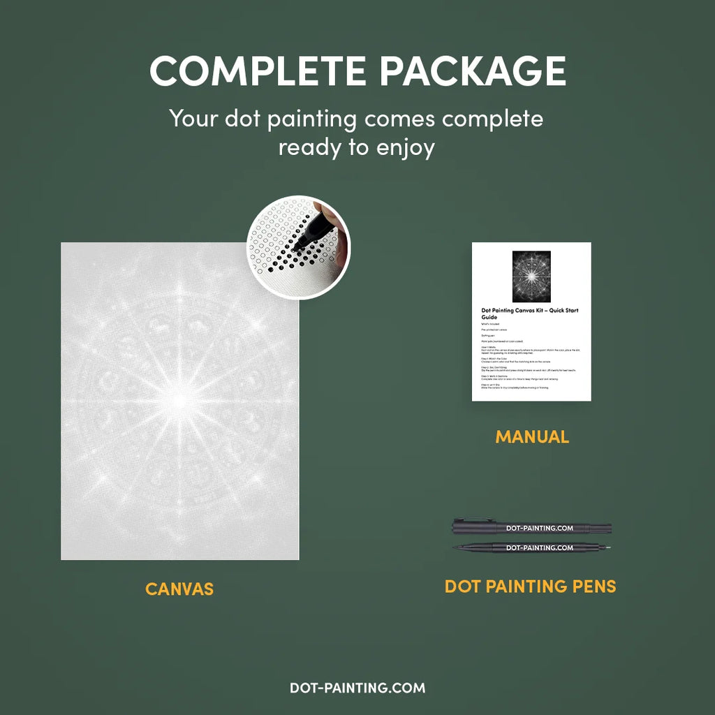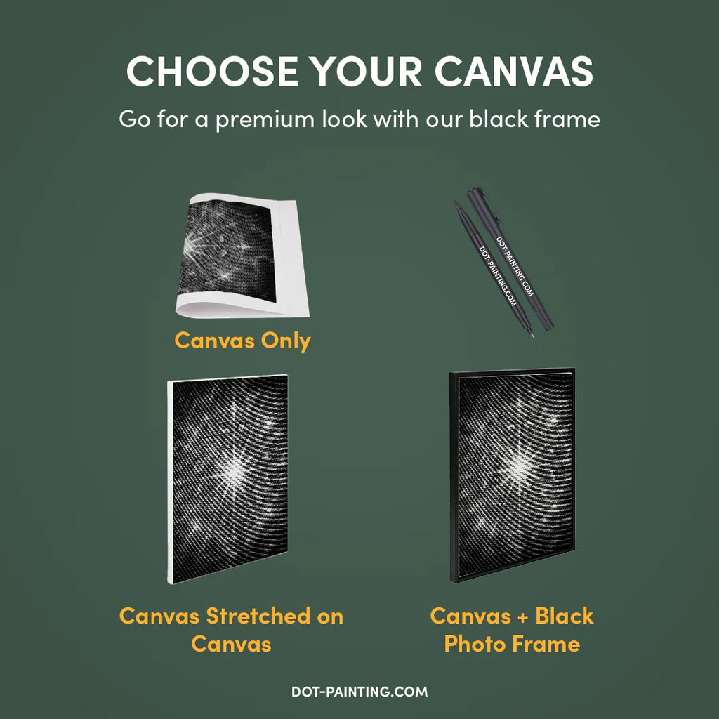 • 1x Toile premium (roulée) : Toile de haute qualité avec le design de votre choix. Nous l’expédions roulée dans un tube rigide, jamais pliée, pour que vous commenciez sur une surface lisse, sans plis.