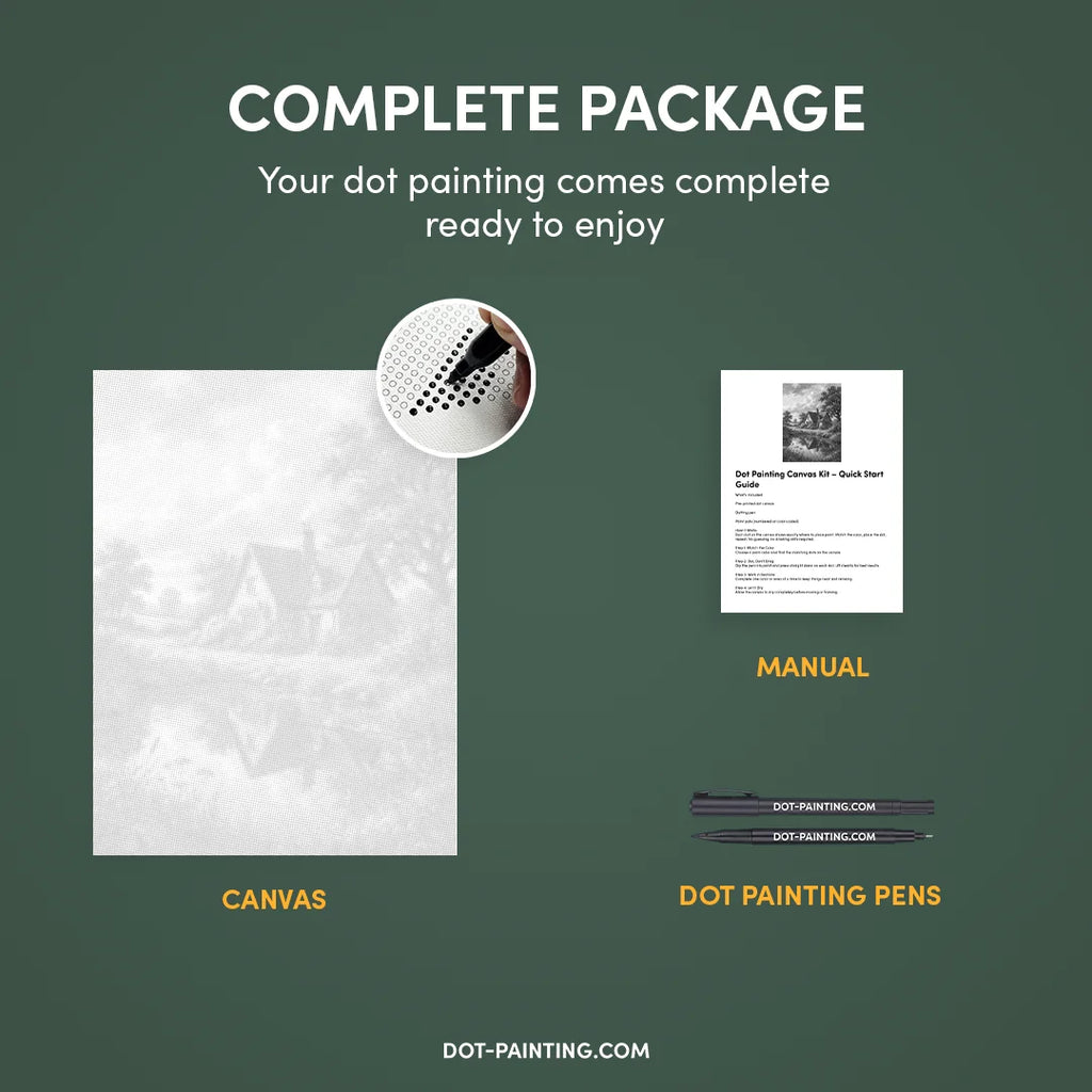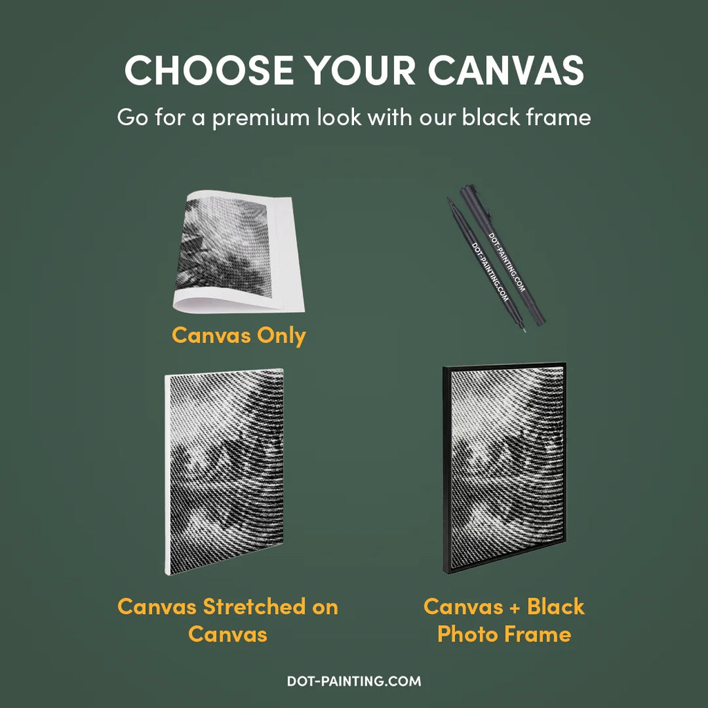 • 1x Toile premium (roulée) : Toile de haute qualité avec le design de votre choix. Nous l’expédions roulée dans un tube rigide, jamais pliée, pour que vous commenciez sur une surface lisse, sans plis.