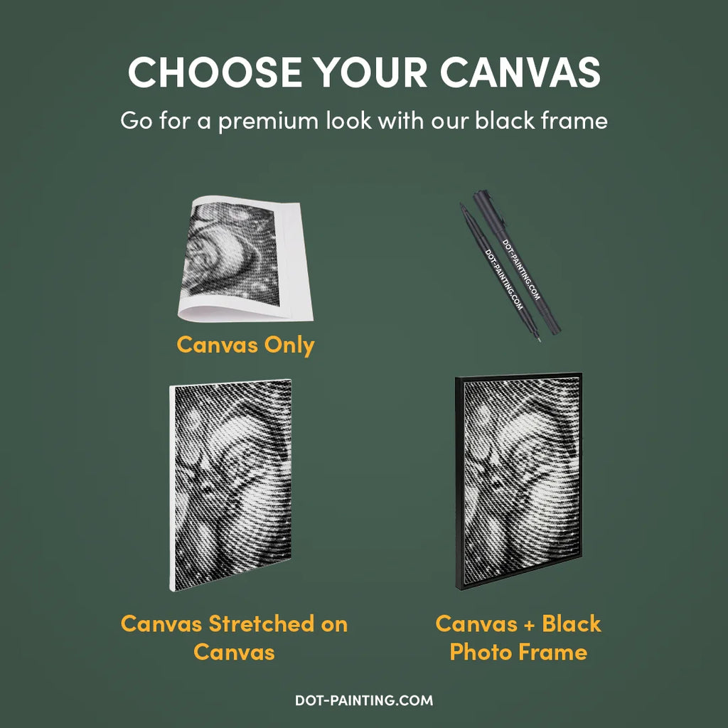 • 1x Toile premium (roulée) : Toile de haute qualité avec le design de votre choix. Nous l’expédions roulée dans un tube rigide, jamais pliée, pour que vous commenciez sur une surface lisse, sans plis.