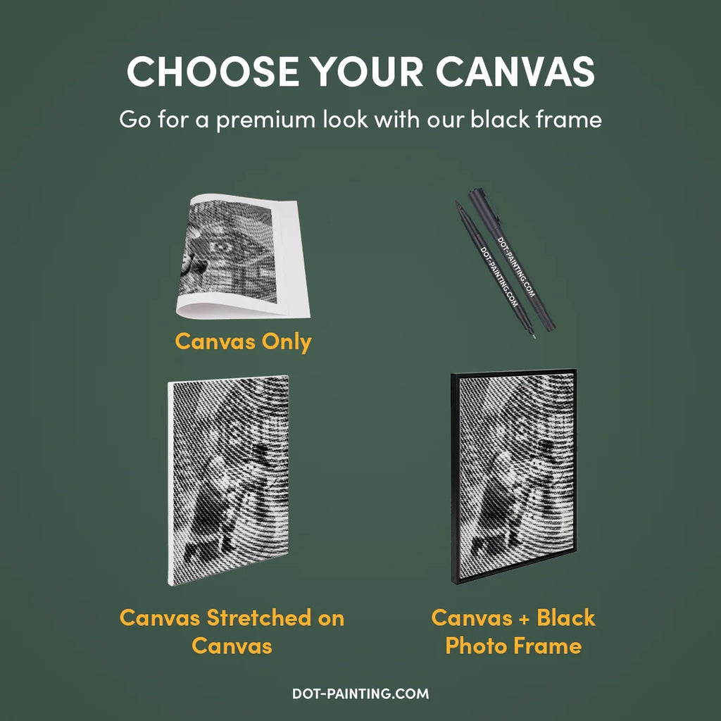 • 1x Toile premium (roulée) : Toile de haute qualité avec le design de votre choix. Nous l’expédions roulée dans un tube rigide, jamais pliée, pour que vous commenciez sur une surface lisse, sans plis.