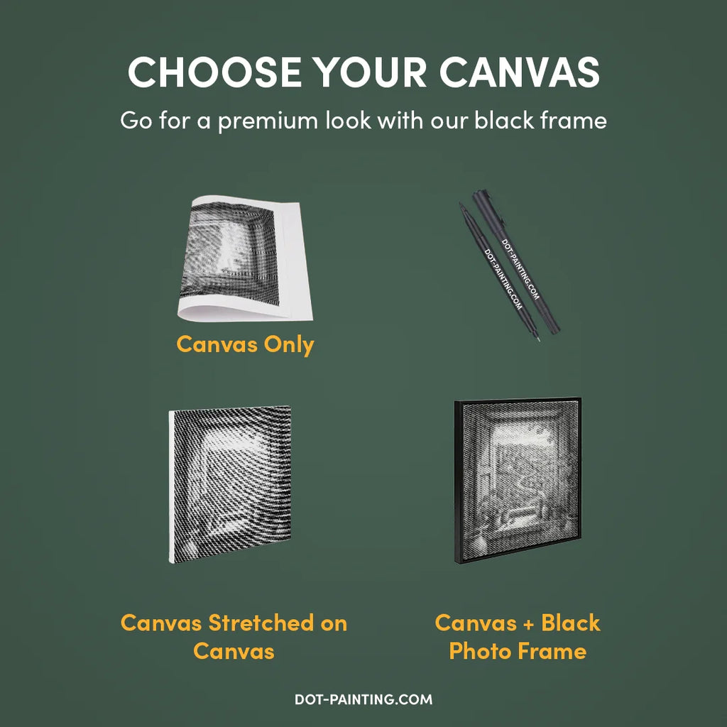 • 1x Toile premium (roulée) : Toile de haute qualité avec le design de votre choix. Nous l’expédions roulée dans un tube rigide, jamais pliée, pour que vous commenciez sur une surface lisse, sans plis.