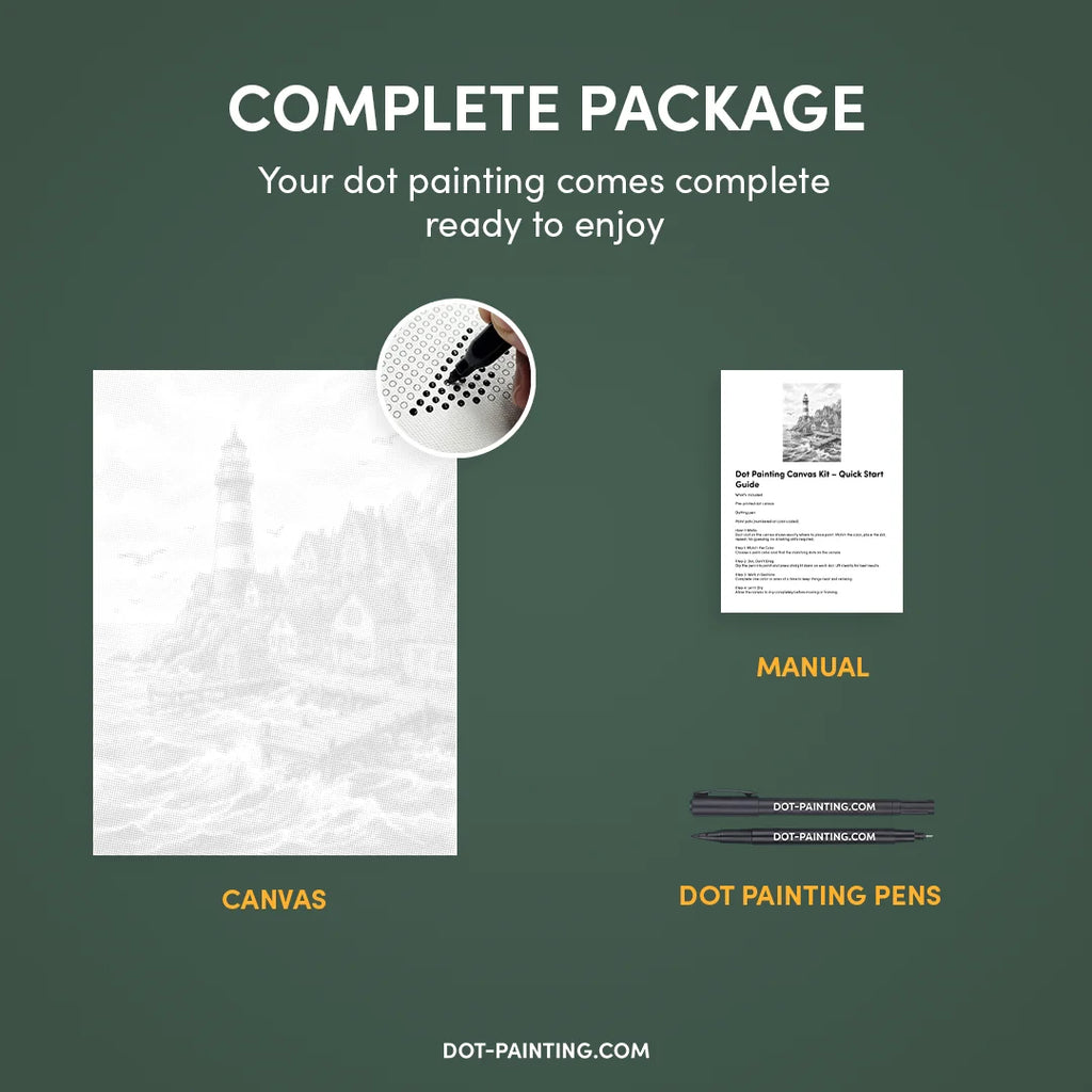• 1x Toile premium (roulée) : Toile de haute qualité avec le design de votre choix. Nous l’expédions roulée dans un tube rigide, jamais pliée, pour que vous commenciez sur une surface lisse, sans plis.
