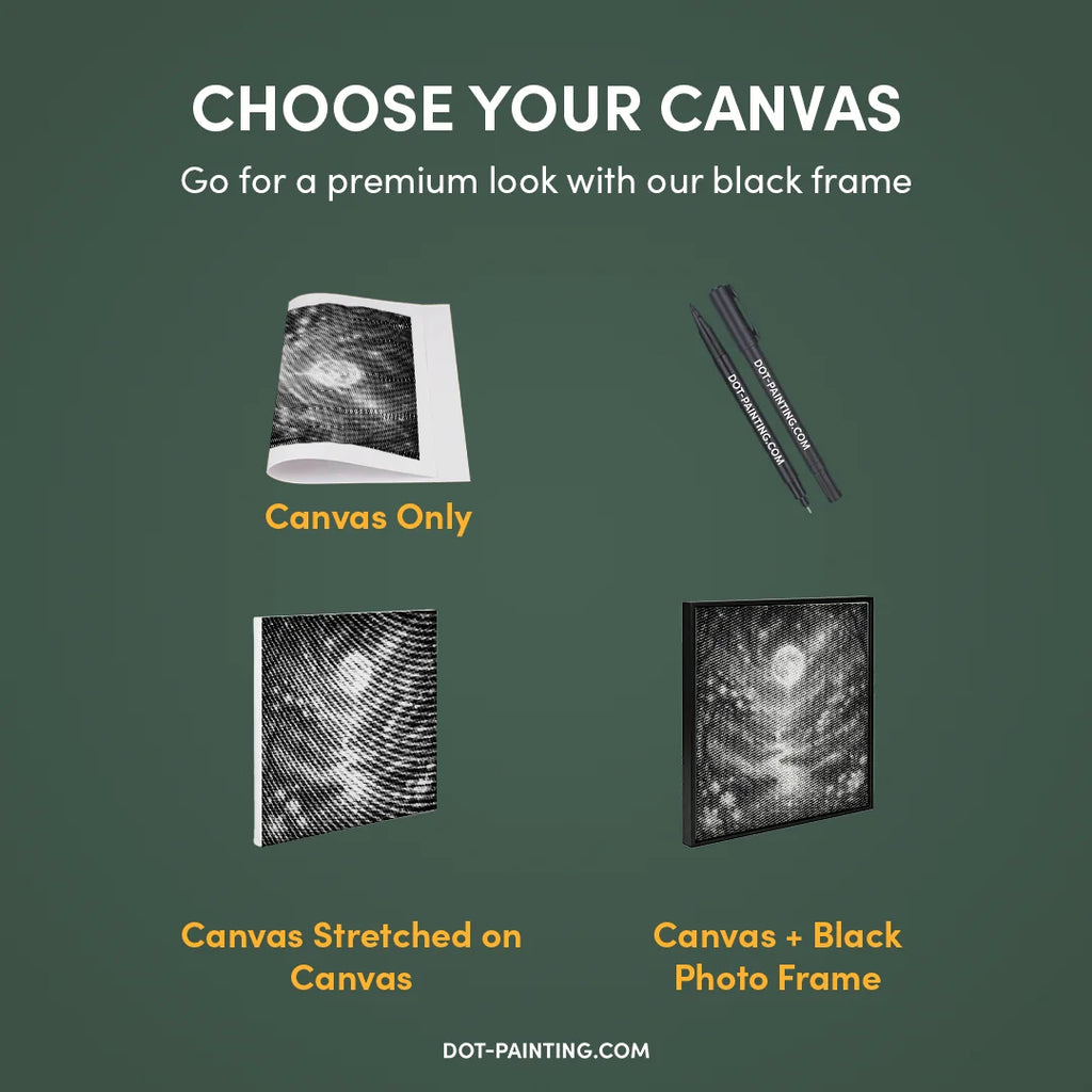 • 1x Toile premium (roulée) : Toile de haute qualité avec le design de votre choix. Nous l’expédions roulée dans un tube rigide, jamais pliée, pour que vous commenciez sur une surface lisse, sans plis.