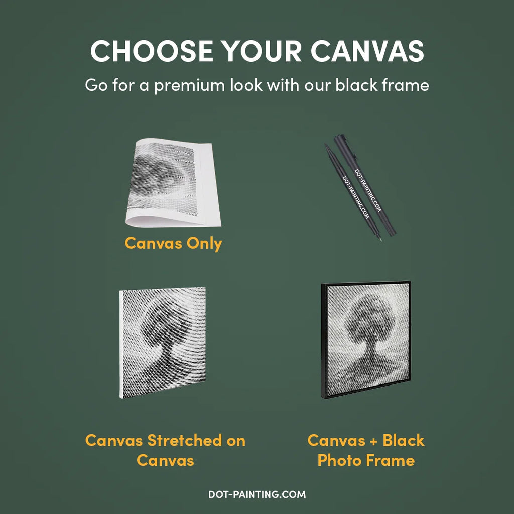 • 1x Toile premium (roulée) : Toile de haute qualité avec le design de votre choix. Nous l’expédions roulée dans un tube rigide, jamais pliée, pour que vous commenciez sur une surface lisse, sans plis.