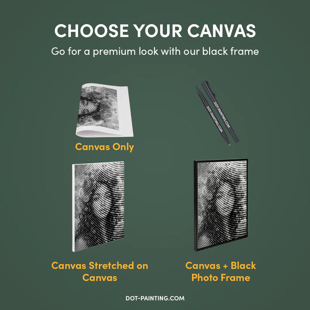 • 1x Toile premium (roulée) : Toile de haute qualité avec le design de votre choix. Nous l’expédions roulée dans un tube rigide, jamais pliée, pour que vous commenciez sur une surface lisse, sans plis.