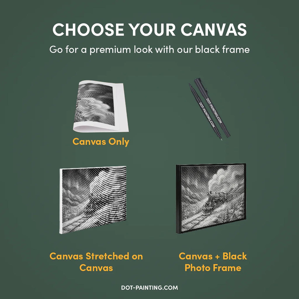 • 1x Toile premium (roulée) : Toile de haute qualité avec le design de votre choix. Nous l’expédions roulée dans un tube rigide, jamais pliée, pour que vous commenciez sur une surface lisse, sans plis.