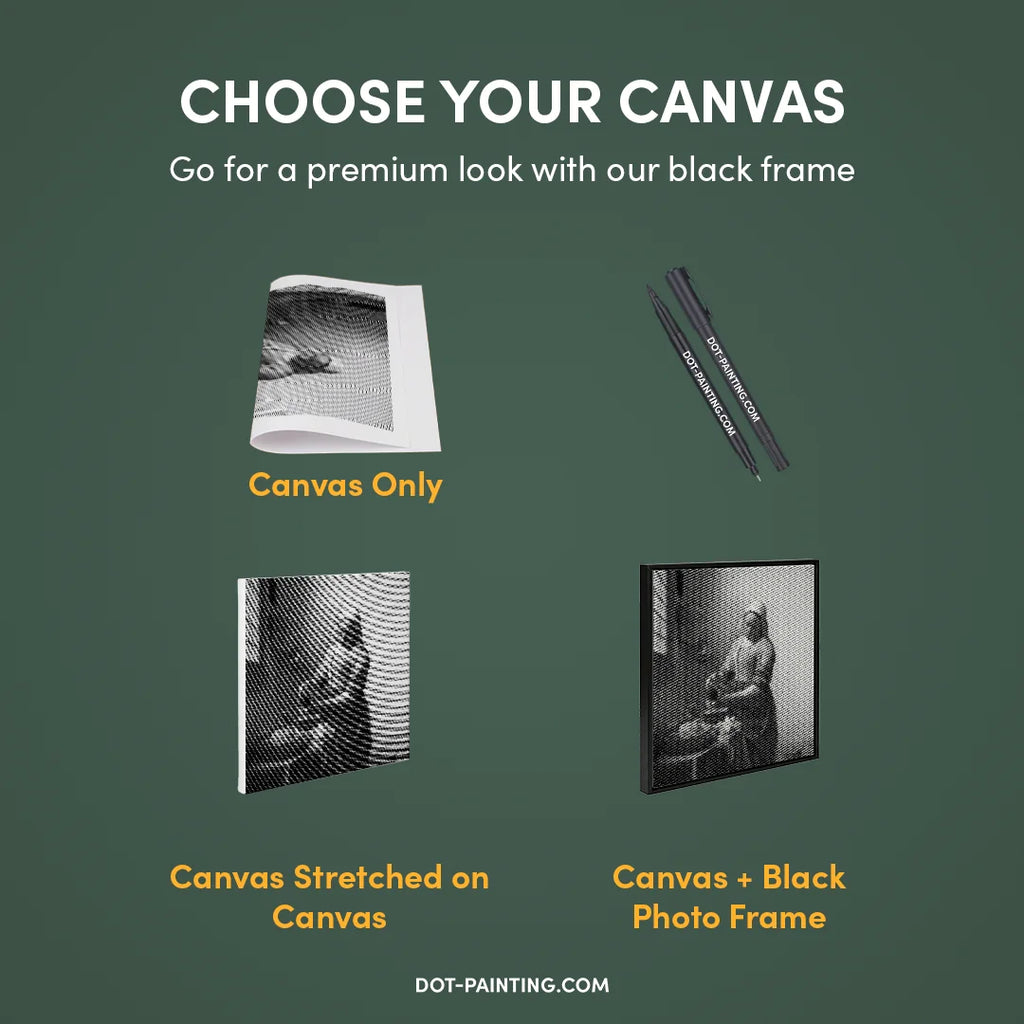 • 1x Toile premium (roulée) : Toile de haute qualité avec le design de votre choix. Nous l’expédions roulée dans un tube rigide, jamais pliée, pour que vous commenciez sur une surface lisse, sans plis.
