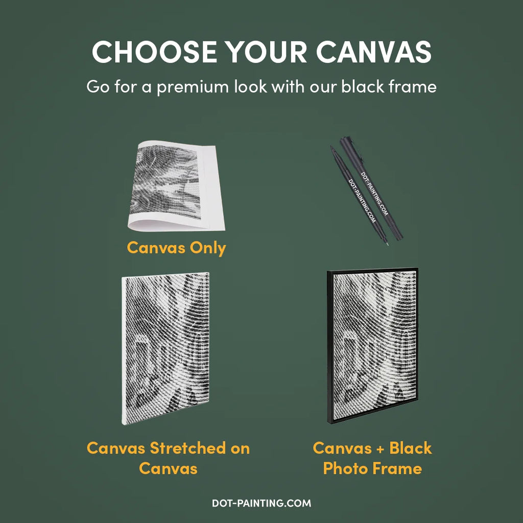 • 1x Toile premium (roulée) : Toile de haute qualité avec le design de votre choix. Nous l’expédions roulée dans un tube rigide, jamais pliée, pour que vous commenciez sur une surface lisse, sans plis.